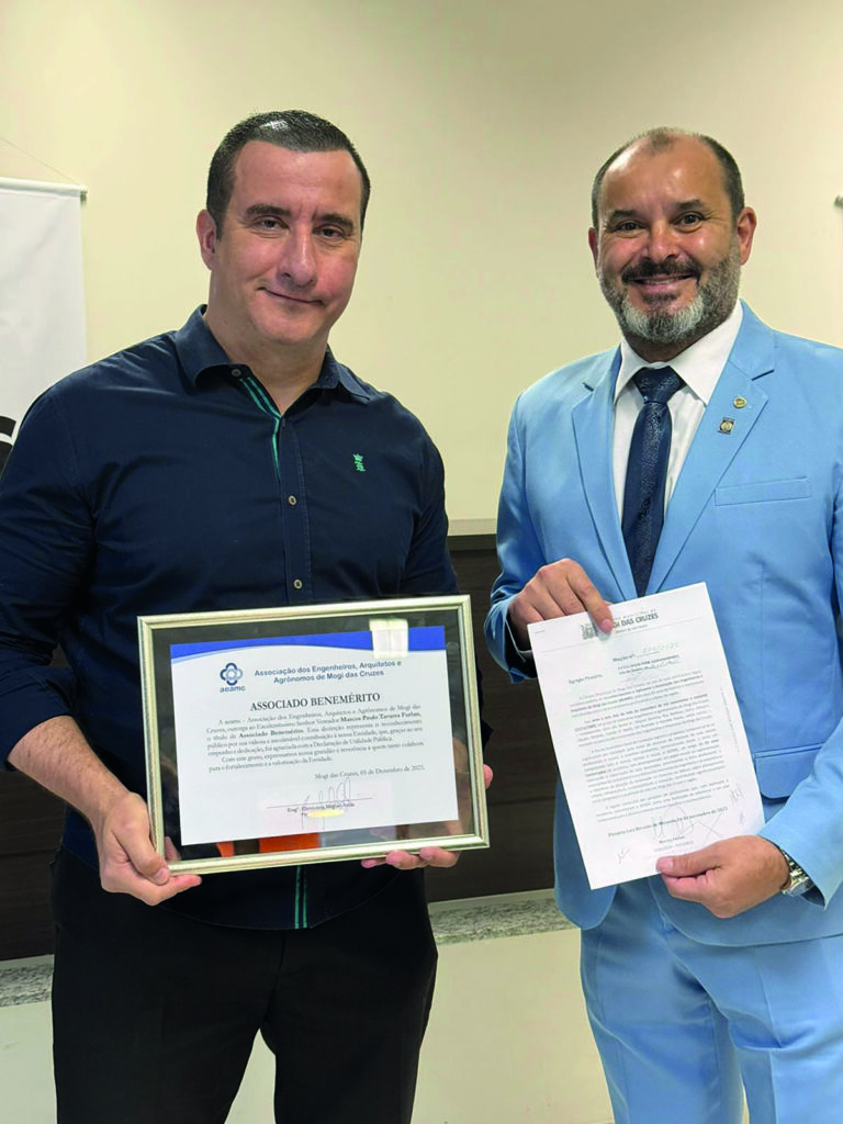 No dia 5, a AEAMC-Associação dos Engenheiros, Arquitetos e Agrônomos de Mogi das Cruzes comemorou os seus 65 anos. Na foto, o vereador Marcos Furlan, que foi agraciado como associado benemérito, acompanha Miguel Assis, presidente da entidade, que recebeu do edil, na data, o documento formal da Moção de Aplauso concedido pela Câmara Municipal