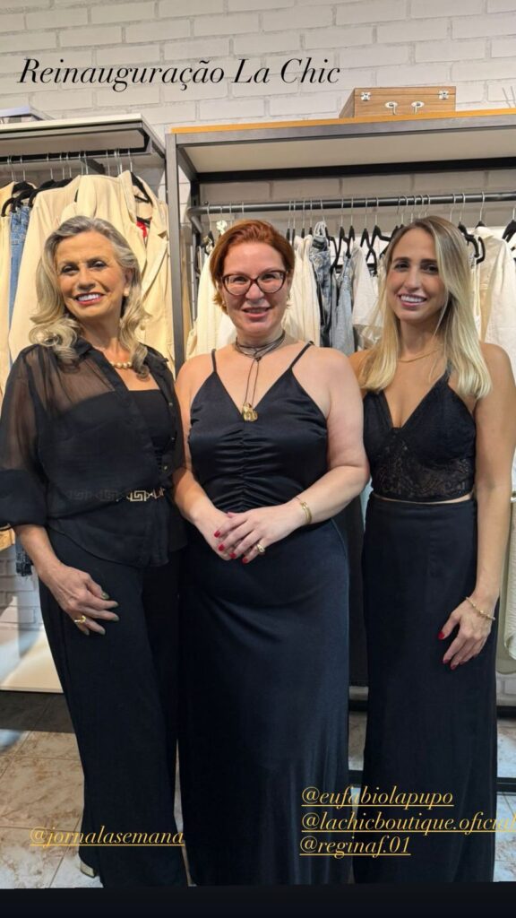 Em um evento privativo, porém cheio de glamour, no dia 5, Regina Faria recebeu mulheres especiais para inaugurar a nova história da La Chic Boutique, e reconhecê-las como sócias-fundadoras do Chic Club. Na foto, junto com a anfitriã, Muriel e eu aderimos ao dress code Preto e Dourado, vestidas com os tops by La Chic. Sucesso, minha querida!